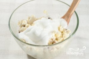Отделите белки от желтков. К творогу добавьте изюм, один желток, сахар и манку. Перемешайте.