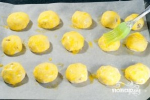 На противень расстелите пекарскую бумагу. Выложите на неё творожники. Смажьте их сверху взбитым желтком.