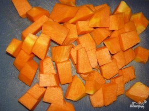 Тыкву очищаем от семян и кожуры, нарезаем крупными кубиками и запекаем в форме, смазанной сливочным маслом и накрытой фольгой. Запекаем примерно 40 минут при 190 градусах.