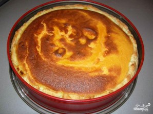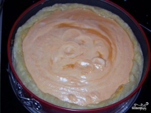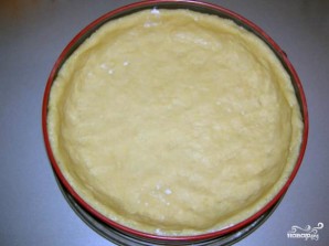 Берем круглую форму для выпечки, выкладываем в него песочное тесто, формируя бортики по краям. Слегка смазываем сливочным маслом и ставим в духовку на 10 минут (температура - где-то 180 градусов).