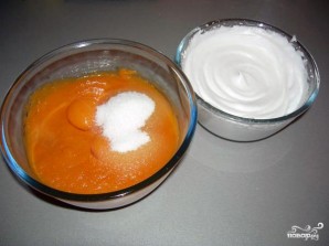 Готовую тыкву достаем из духовки и измельчаем до консистенции пюре при помощи блендера. Ненужную жидкость из пюре отжимаем. Смешиваем пюре с желтками, специями и половиной сахара. Белки в отдельной миске взбиваем с сахаром до консистенции пены.