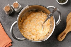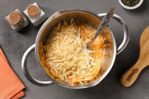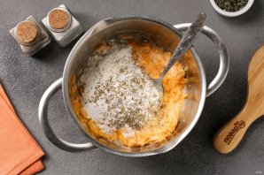 Перемешайте и добавьте тёртый на крупной тёрке сыр.