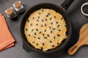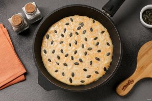 Разогрейте сковороду, смазанную маслом. Выложите тесто, разровняйте, посыпьте сверху тыквенными семечками и накройте крышкой.