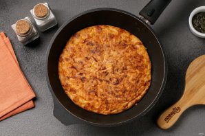 Аккуратно переверните запеканку при помощи тарелки и готовьте ещё около 5 минут. Тарелку предварительно смажьте маслом, чтобы запеканка не прилипла.