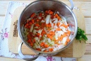 In a saucepan where you will cook the soup, heat vegetable oil, add finely chopped onion, and sauté until soft. Then add grated carrot and minced garlic, cook for a few minutes.
