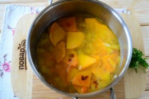 Cut the baked pumpkin into several pieces and also add to the pot.