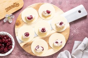 Смажьте края одного кружка водой, сложите пополам и плотно защипните. Можно свернуть края косичкой или пройтись по ним вилкой, чтобы они лучше закрепились.