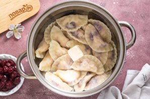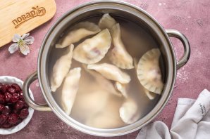 Опустите вареники в кипящую чуть подсоленную воду. Дождитесь, когда они всплывут и варите еще 4-6 минут. После слейте воду, а вареники аккуратно откиньте на сито.