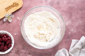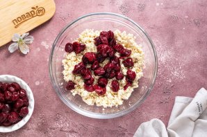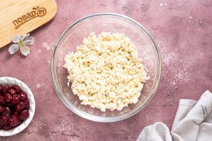 Если используете свежую вишню, то помойте, обсушите и удалите косточки. Заморозку предварительно необходимо разморозить и отжать от сока. Добавьте вишню к тофу, перемешайте.