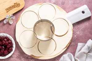 Тесто разделите на 2 части, чтобы его было проще раскатать. Раскатайте тесто в тонкий пласт толщиной в пару мм. С помощью стакана сделайте кружки для вареников.