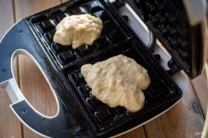 Рабочие поверхности электрической вафельницы смажьте тонким слоем растительного масла и выкладывайте на каждую поверхность по 1-2 столовые ложки теста. Вафли выпекайте 2-3 минуты до появления золотистой корочки.