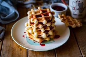 Готовые вафли выложите на тарелку стопочкой, полейте любимым сиропом и подавайте к столу.