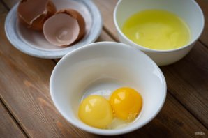 Яйца очень аккуратно поделите по разным мисочкам на желтки и белки.