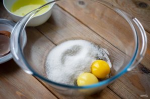 В миску высыпьте сахар, ванильный сахар, соль и добавьте желтки.