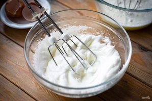 В отдельную, сухую миску выложите белковую массу и взбейте ее миксером до получения устойчивых пиков.