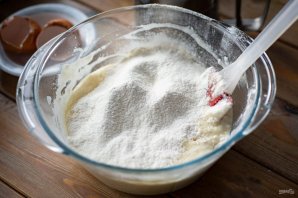 В миску с желтковой массой аккуратно вмешайте лопаткой взбитые белки до полного соединения и в эту смесь просейте муку с разрыхлителем.