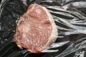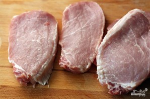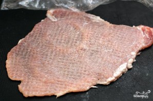 Wrap each piece of pork in plastic wrap and thoroughly pound both sides.