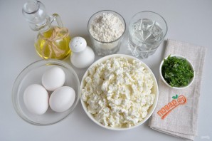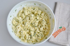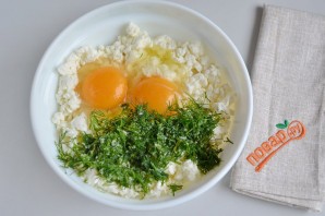 2. Для начинки возьмите творог, соедините его с двумя сырыми яйцами, укропом, солью. По желанию можно добавить черный молотый перец.