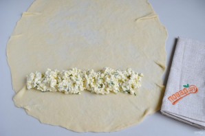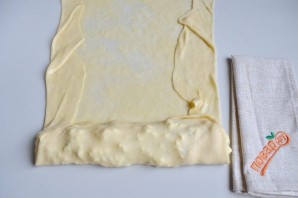 10. Положите "вытянутое" тесто на стол, если края толстые, то дополнительно пройдитесь скалкой. Положите треть творожной массы. Смажьте поверхность растительным маслом, кроме того места, где начинка.
