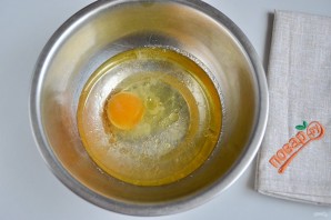 4. Теперь можно сделать тесто: в миске соедините воду, масло, яйцо и соль. Венчиком хорошо перемешайте.