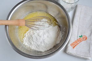 5. Вводите муку небольшими порциями. Когда венчиком будет тяжело перемешивать, возьмите ложку.