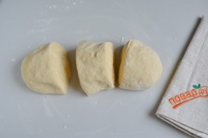 7. Смажьте тесто растительным маслом, разделите на 3 одинаковых части. Две верните в миску под пленку, одну оставьте на столе, ее будем раскатывать-растягивать.