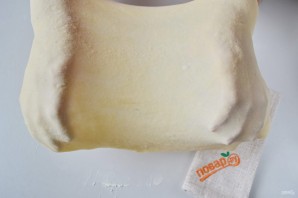 9. Возьмите тесто "на руки", растягивайте, перемещайте на руках по всему периметру, но не тяните слишком сильно, чтобы тесто не порвалось.