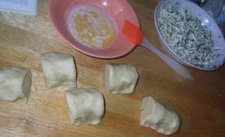 Для начала приготовим тесто. Муку насыпаем в миску горкой, делаем в ней небольшое углубление и вливаем в него смесь воды и половинки взбитого яйца. Добавляем растительное масло, сливочное, маргарин и немного соли. Из всех этих ингредиентов замешиваем мягкое и эластичное тесто, скатываем его в шарик, кладем в миску, накрываем полотенцем и оставляем отдыхать на пол часа. По истечении времени разделяем тесто на несколько равных частей (у меня 5). В отдельной миске смешиваем тертую брынзу и измельченную зелень.