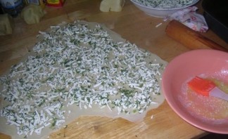 Теперь берем один кусочек теста и аккуратно раскатываем его как можно тоньше, затем растягиваем его руками, чтобы пласт стал совсем тоненьким. Сбрызгиваем его топленым сливочным маслом и выкладываем на тесто приготовленную начинку, равномерно ее распределяем.
