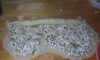 Теперь сворачиваем тесто с начинкой в рулет. Это нужно делать очень аккуратно, чтобы тесто не порвалось.