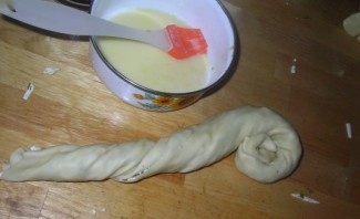 Немного перекручиваем рулет от середину к концам и сворачиваем его улиткой. То же самое проделываем с остальными кусочками теста.