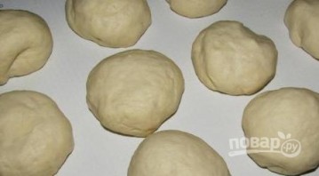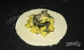 Каждый шарик раскатайте в лепёшку. В центр каждой уложите начинку.