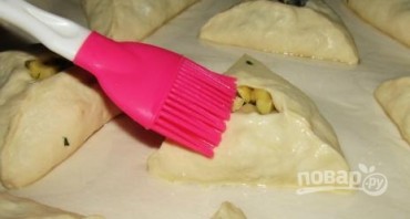 Промажьте курники взбитым желтком. Оставьте их на 15 минут на противне, застеленном пергаментной бумагой.