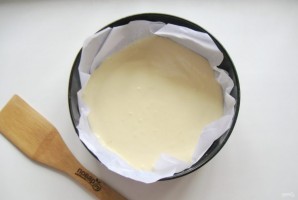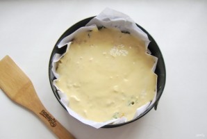 Форму для выпечки застелите пергаментом. Выложите половину теста.