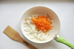 Прежде всего нам нужна начинка для пирога. Репчатый лук и морковь очистите, помойте. Лук нарежьте мелким кубиком, а морковь натрите на терке. Выложите в сковороду.
