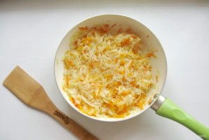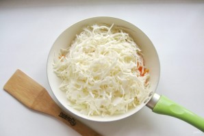 Капусту нарежьте тонкой соломкой и добавьте к луку и моркови в сковороду. Налейте подсолнечное масло и 50 мл воды.