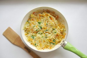 Когда морковь, лук и капуста будут готовы, посолите по вкусу и добавьте нарезанную петрушку. Начинка для пирога готова.