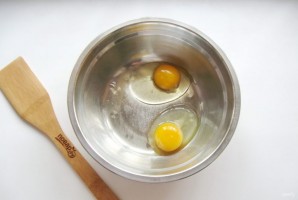 Приготовьте тесто для пирога. В миску разбейте яйца.