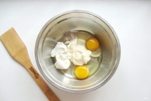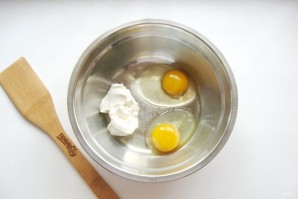 Хорошо перемешайте венчиком яйца с майонезом и сметаной. Добавьте соль и разрыхлитель.