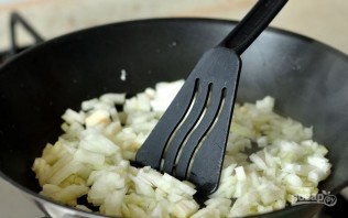 Place a frying pan on the stove and heat it. Melt a piece of butter in the pan. Peel the onion and dice it. Sauté the onion in the butter until golden, then press the peeled garlic cloves through a garlic press and add them to the onion.