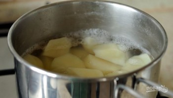Pour water into a saucepan and bring it to a boil. Peel and wash the potatoes. Place the potatoes into the boiling water, add salt, and cook until tender. Then drain off the excess liquid, add a piece of butter, and pour in the milk. Prepare the mashed potatoes.