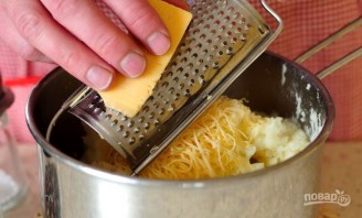 Grate any type of hard cheese and add it to the mashed potatoes. Salt and pepper to taste, then mix everything thoroughly.
