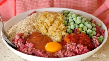 In a large bowl, combine the ground beef with green peas, breadcrumbs, barbecue sauce, and tomato sauce. Add a raw chicken egg, then season with salt and pepper. Mix everything thoroughly.