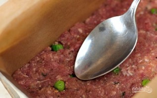 Take an oblong baking dish and line it with parchment paper. Place the minced meat into the dish and press it down with a spoon.