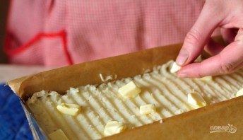 Place pieces of butter on top of the purée so that it doesn't become dry during cooking. Preheat the oven to 180 degrees, bake the dish for 40 minutes.