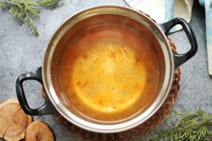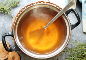 Выложите в кастрюлю набухший желатин и перемешайте до растворения желатина. Процедите все через мелкое сито и остудите.