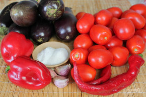 Баклажаны и перец пропускаем через мясорубку и добавляем в кастрюлю к остальным ингредиентам. Кипятим аджику 5-7 минут и разливаем по стерильным банкам. Закатываем металлическими крышками.