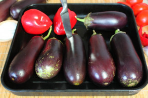 Баклажаны и перец прокалываем и отправляем в духовку. Запекаем при температуре 190-200 градусов, около 30 минут.