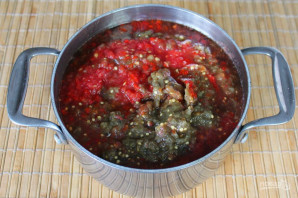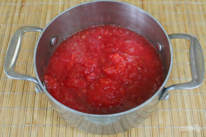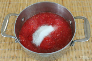 Добавляем в томат соль и сахар, ставим кастрюлю на огонь.