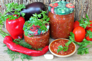 Аджика из печеных баклажанов, помидоров и перца готова.
